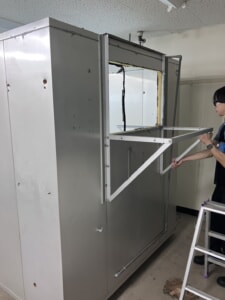 元々、先月より入らせていただいている某大学移転作業の一部で、教育学部研究所にあった『恒温恒湿室』(トップ写真参照)という気密性の高い箱が不用になった為、解体・回収作業をして欲しい、とご依頼をいただいたものです。